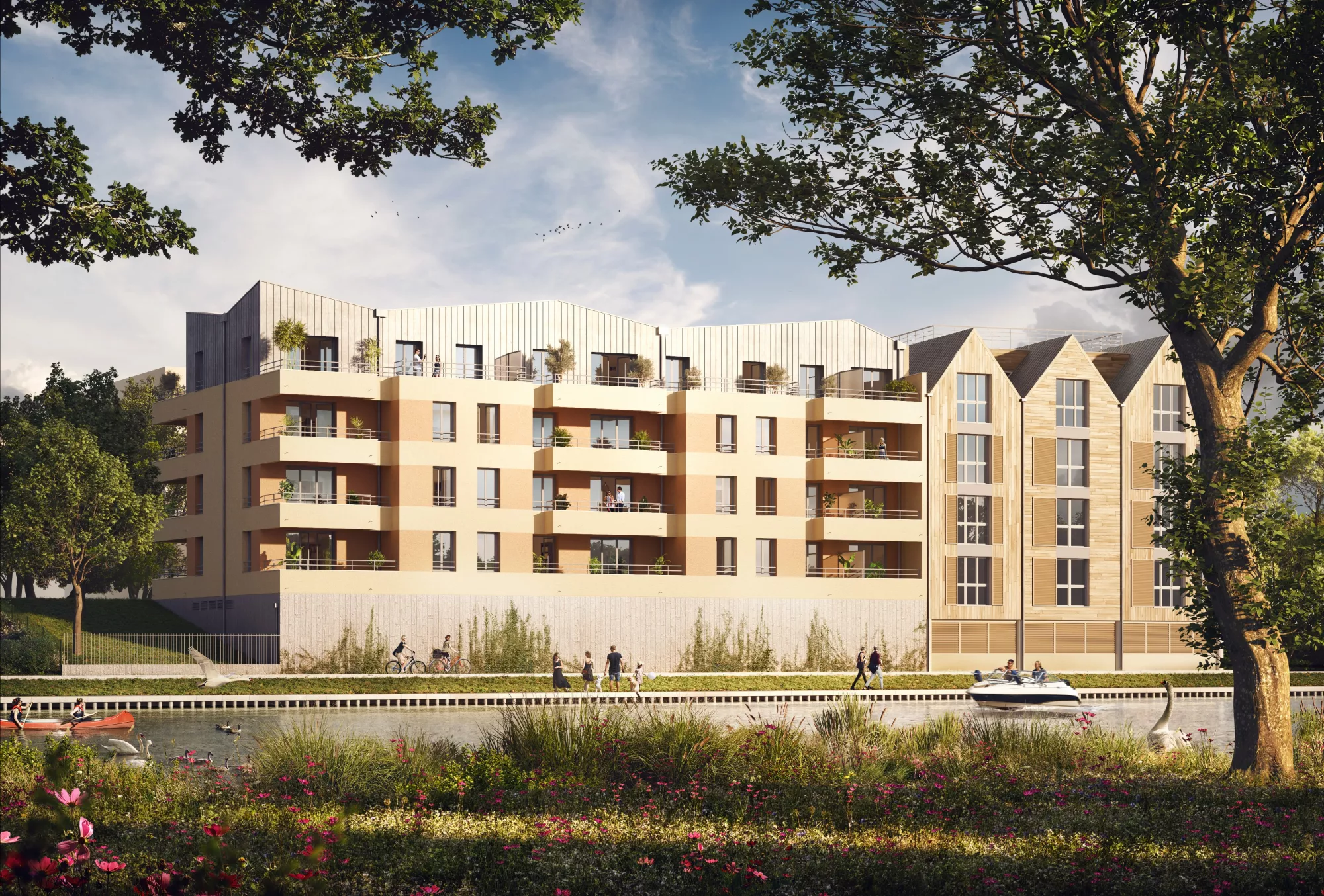 Au cœur d’un ensemble résidentiel verdoyant et arboré, s’élevant le long du chemin de halage, la résidence Les Eaux Belles dévoile une architecture aux lignes épurées, résolument contemporaine. Terrasses et balcons fleurissent en façades, comme une invitation à prendre l’air et profiter des rayons de soleil…